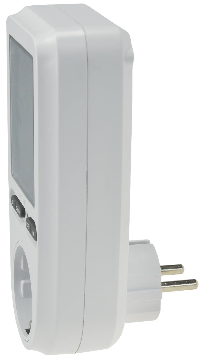 - Anzeige: Aktuelle Leistung (W), Stromkosten (€), Verbrauch (kWh), Leistungsfaktor (0,2-1,0), Netzspannung (V), Stromstärke (A), Netzfrequenz (Hz)