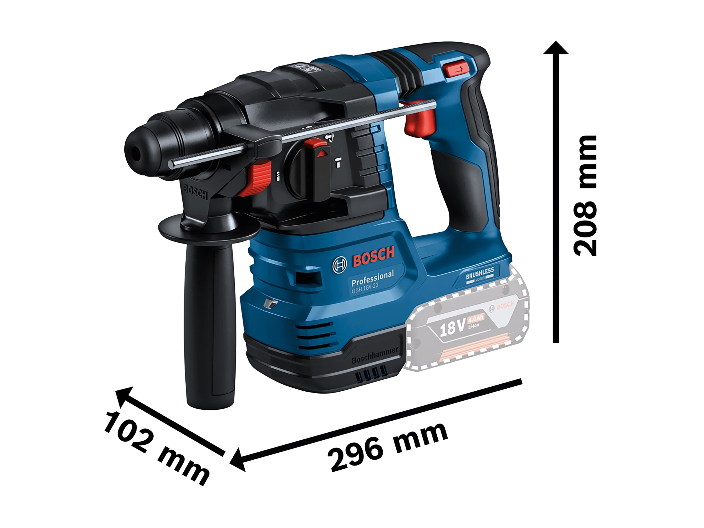 Bosch GBH 18V-22 Bohrhammer: Der leistungsstarke Bohrhammer GBH 18V-22 ist ideal für anspruchsvolle Bohr- und Meißelarbeiten in Beton, Mauerwerk und Stein. Mit einer Schlagenergie von bis zu 2,2 Joule und einem robusten Schlagwerk bietet der GBH 18V-22 hervorragende Performance bei gleichzeitig geringer Vibration und hoher Benutzerfreundlichkeit.