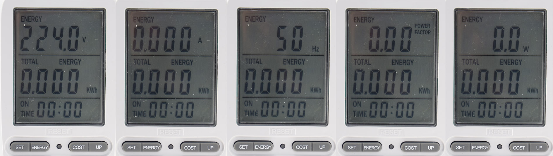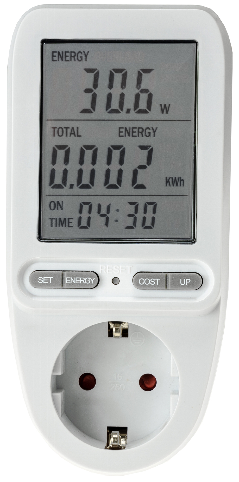- Anzeige: Aktuelle Leistung (W), Stromkosten (€), Verbrauch (kWh), Leistungsfaktor (0,2-1,0), Netzspannung (V), Stromstärke (A), Netzfrequenz (Hz)