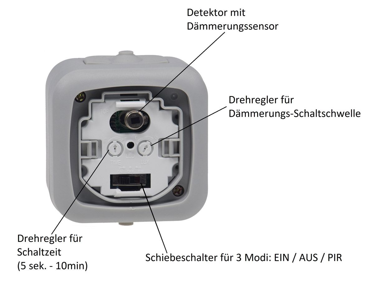 - Flexibel einstellbar: Die Dämmerungsschwelle lässt sich zwischen 2 und 1000 Lux einstellen und die Schaltdauer flexibel zwischen 5 Sekunden und 10 Minuten anpassen.